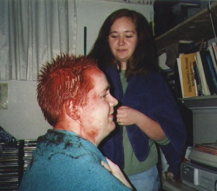 This is what happens when a Chem. Eng. tries to dye your hair. My advice, just don't do it. Jay is pretty trusting though and Tiff just takes advange of him. Just kidding, he asked to look like someone split his head open.